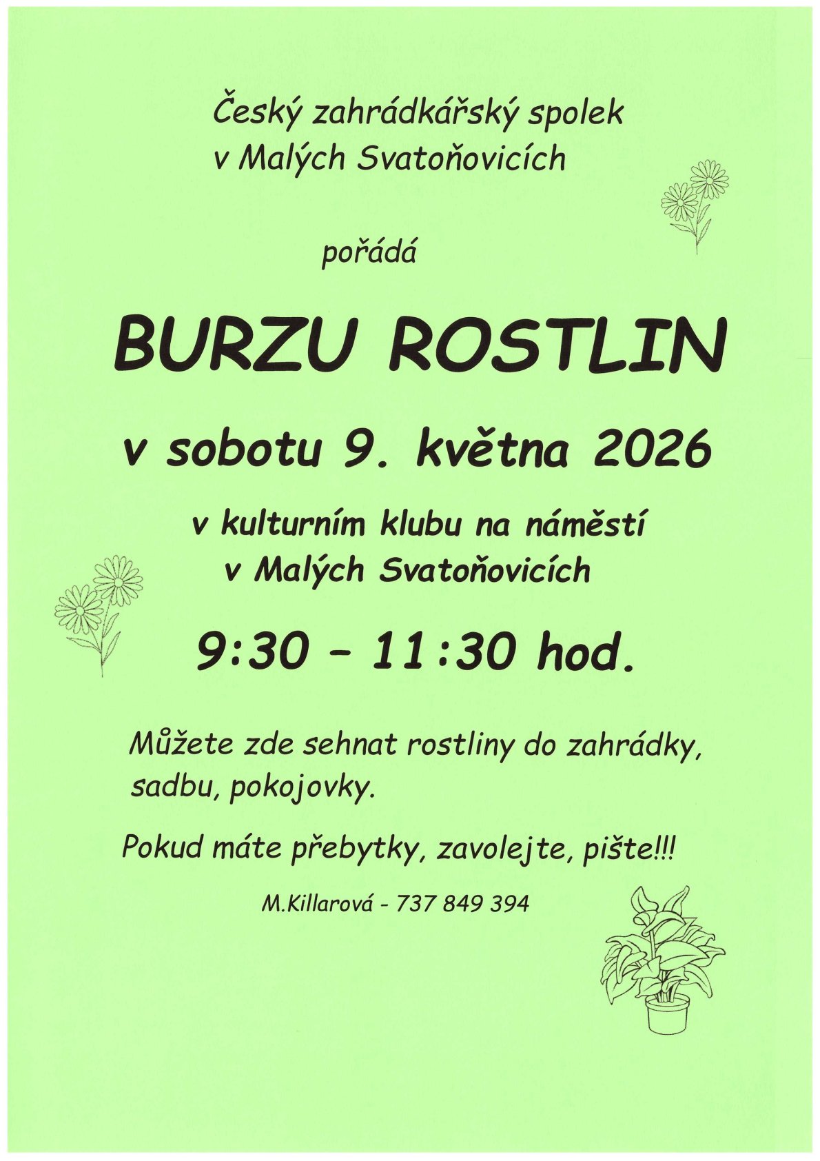 Český zahrádkářský spolek v Malých Svatoňovicích pořádá Burzu rostlin - v sobotu 9. května 2026, od 9:30 do 11:30 hodin, v kulturním klubu v Malých Svatoňovicích. Plakát zde.