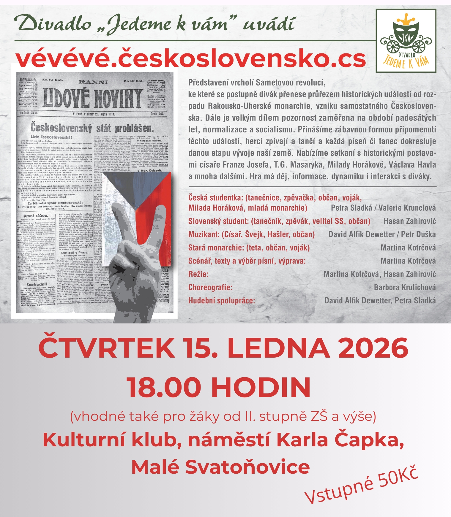 Divadlo "Jedeme k vám" uvádí divadelní představení vévévé.československo.cz - čtvrtek 15. ledna 2026, 18:00, Kulturní klub, nám. K. Čapka Malé Svatoňovice (vhodné také pro žáky od II. stupně ZŠ a výše). Vstupné 50 Kč. Plakát zde.