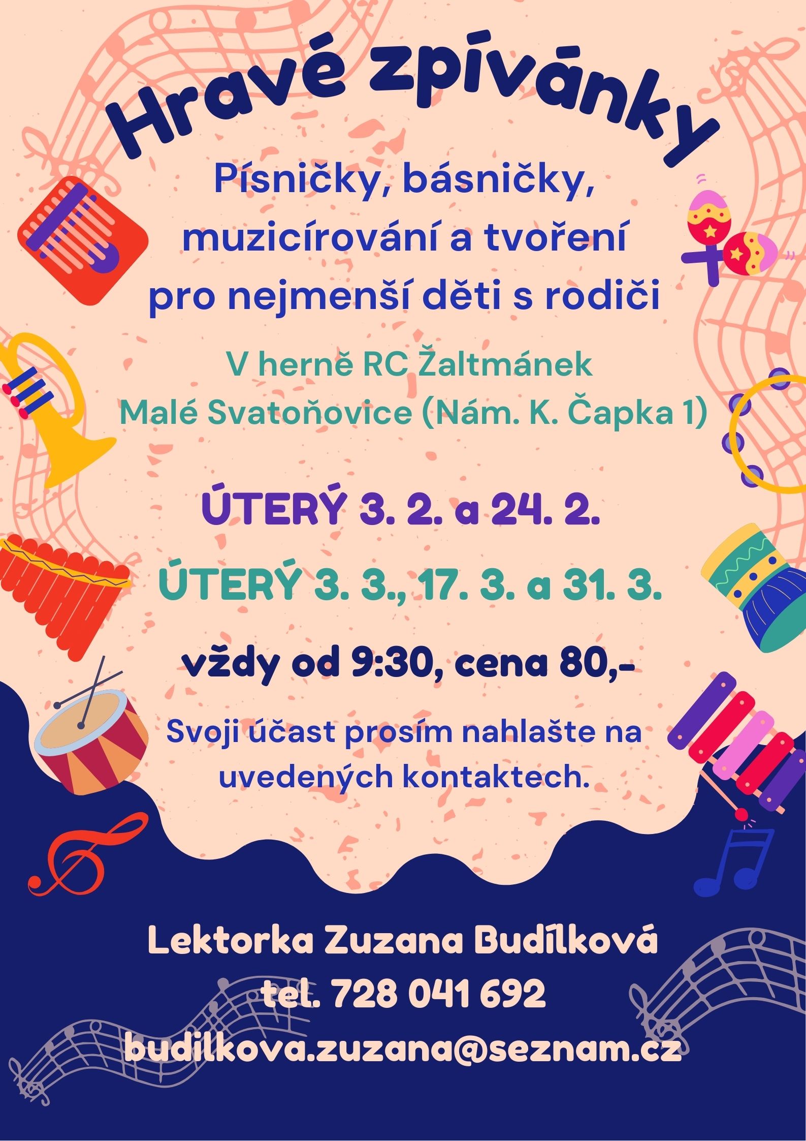 Písničky, básničky, muzicírování a tvoření pro nejmenší děti s rodiči v herně RC Žaltmánek, Malé Svatoňovice (nám. K. Čapka 1) - úterý 03.02., 24.02., 03.03. 17.03. a 31.03.2026, vždy od 09:30, cena 80 Kč. Podrobné informace najdete na plakátu zde.