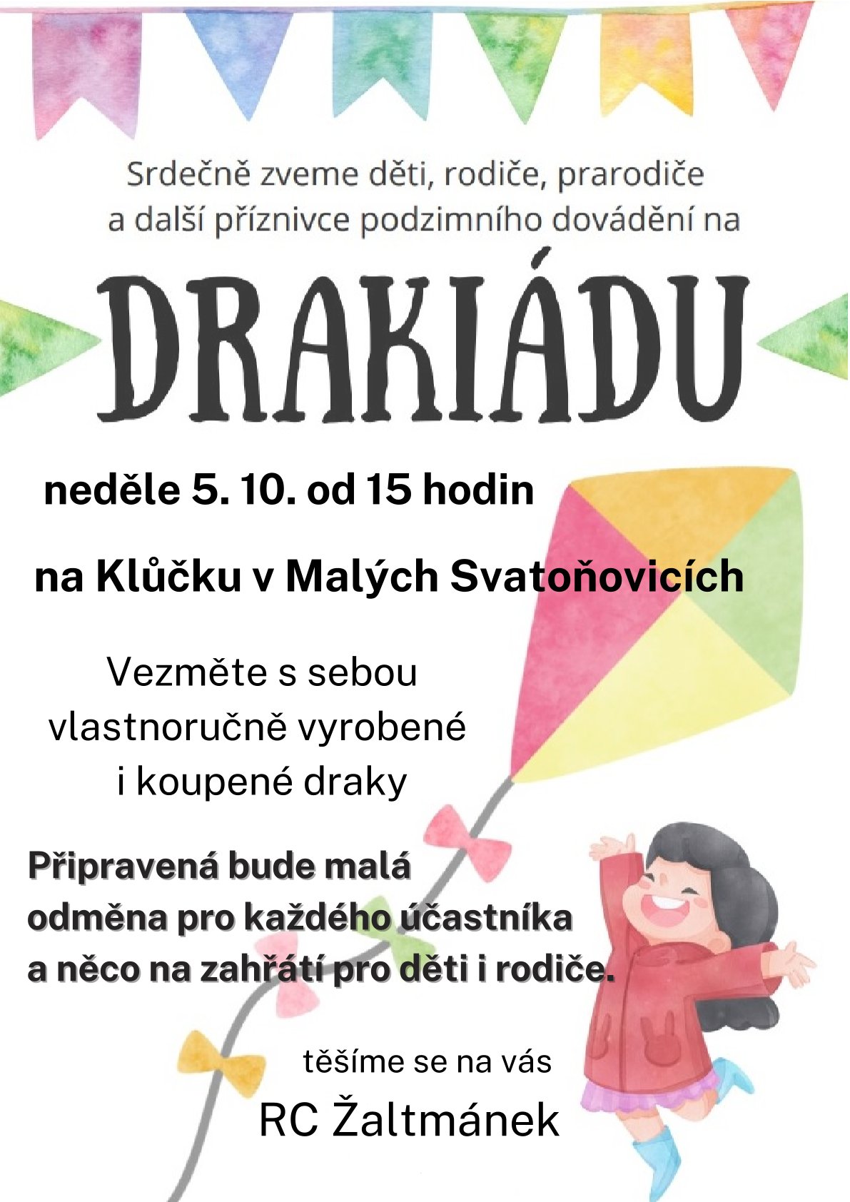 RC Žaltmánek srdečně zve na DRAKIÁDU - v neděli 05.10.2025 v 15 hodin na Klůčku v Malých Svatoňovicích. Vezměnte s sebou vlastnoručně vyrobené i koupené draky! Připravená bude malá odměna pro každého účastníka a něco na zahřátí pro děti i rodiče. Plakát zde.