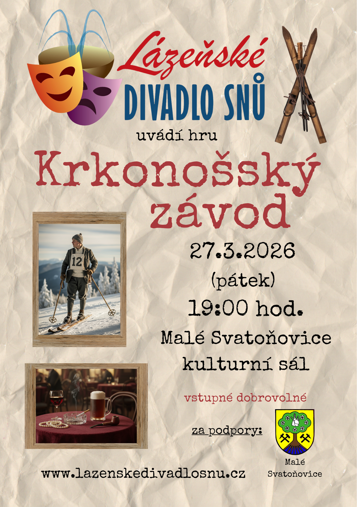 Lázeňské DIVADLO Snů uvádí hru KRKONOŠSKÝ ZÁVOD - v pátek 27.03.2026 od 19 hodin, ve velkém sále Kulturního klubu v Malých Svatoňvicích. Vstupné dobrovolné. Plakát zde.