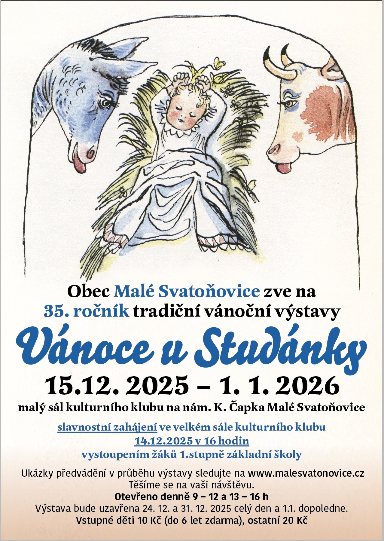 Obec Malé Svatoňovice zve na tradiční vánoční výstavu VÁNOCE U STUDÁNKY, která potrvá od 15.12.2025 do 01.01.2026 v malém sále kulturního klubu na náměstí K. Čapka v Malých Svatoňovicích. Slavnostní zahájení v neděli 14.12.2025 v 16:00 hodin ve velkém sále kulturního klubu. Více informací na plakátu zde.