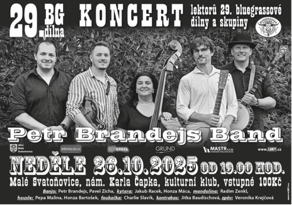 Zveme Vás na koncert lektorů 29. bluegrassové dílny a skupiny Petr Brandejs band v neděli 26.10.2025 od 19 hodin v Kulturním klubu v Malých Svatoňovicích. Vstupné 100 Kč. Plakát najdete zde.