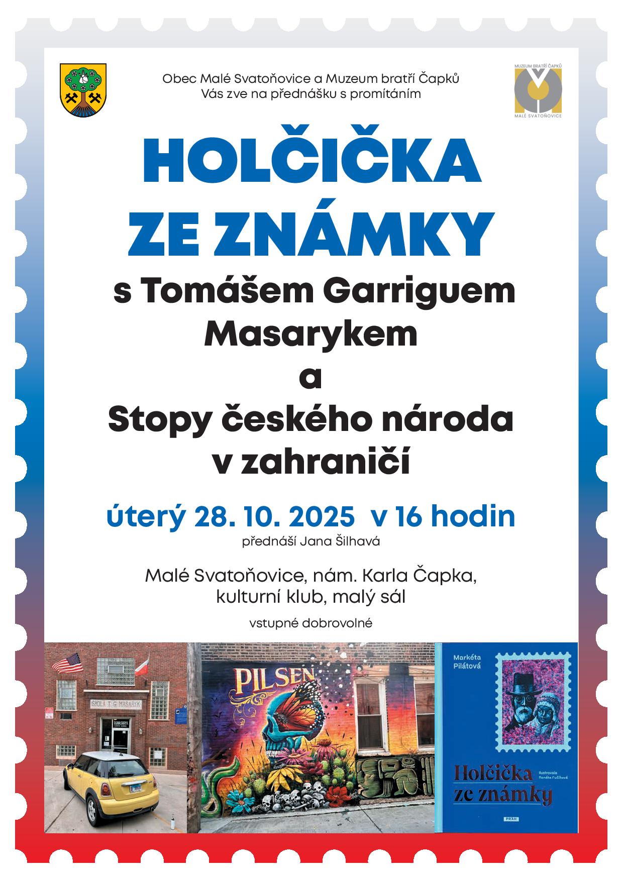 Obec Malé Svatoňovice a Muzeum bratří Čapků Malé Svatoňovice vás zve na přednášku s promítáním Holčička ze známky s Tomášem Garriquem Masarykem a Stopy českého národa v zahraničí, která se koná v úterý 28.10.2025 v 16 hodin v malém sále kulturního klubu na náměstí v Malých Svatoňovicích. Přednáší Jan Šilhavá. Vstupné dobrovolné. Plakát zde.