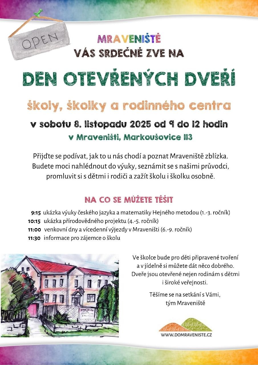 Mraveniště Vás sdrečně zve na DEN OTEVŘENÝCH DVEŘÍ školy, školky a rodinného centra - v sobotu 8. listopadu 2025 od 9 do 12 hodin v Mraveništi, Markoušovice 113. Více informací na plakátu zde.