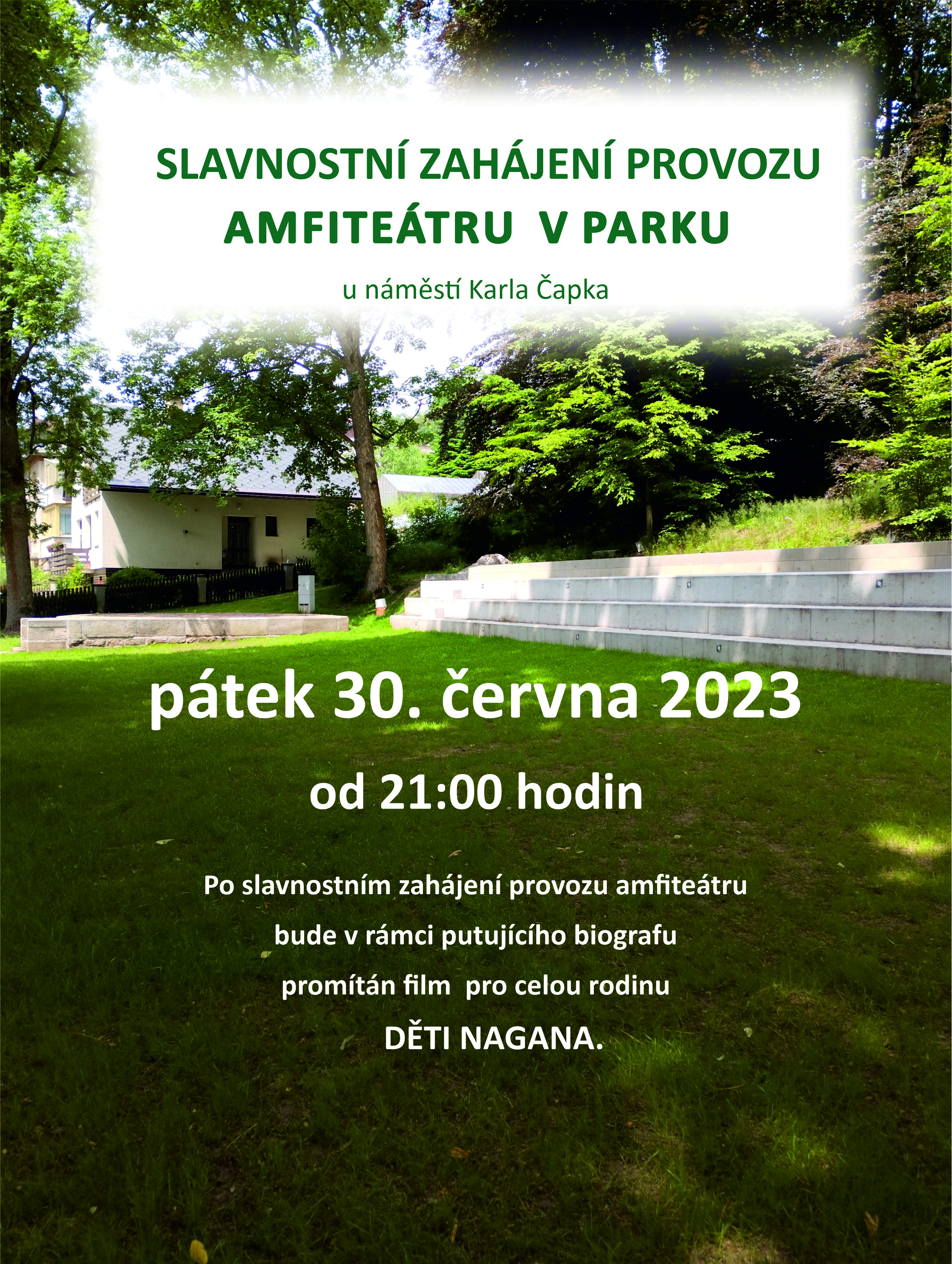 V pátek 30. června 2023 od 21:00 hodin se koná slavnostní zahájení provozu amfiteátru v parku u náměstí K. Čapka v Malých Svatoňovicích. Po slavnostním zahájení bude v rámci putujícího biografu promítán film pro celou rodinu DĚTI NAGANA. Plakát zde.