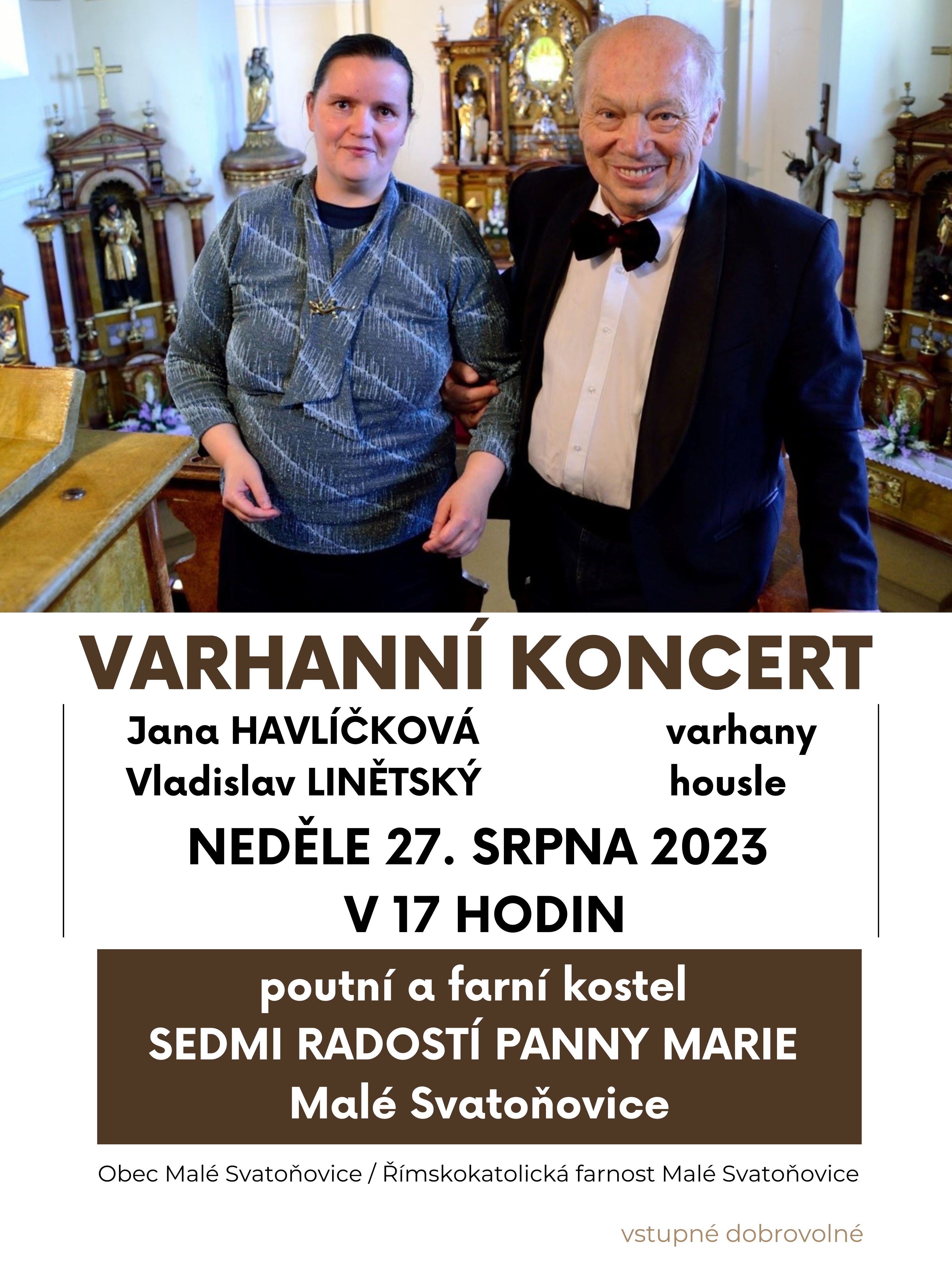 Společně s Římskokatolickou farností Malé Svatoňovice Vás zveme na Varhanní koncert Jany Havlíčkové a Vladislava Linětského. Koncert se koná v neděli 27. srpna 2023 od 17 hodin v poutním a farním kostele SEDMI RADOSTÍ PANNY MARIE v Malých Svatoňovicích. Pozvánka zde.